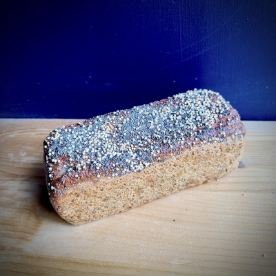 ![]() | Petit Bellone moulé Farine semi complète de blé (T80), levain de seigle, graines de millet, lin doré broyé, flocons d'avoine et chia, sel de Camargue, eau filtrée | 500 g | 4.10 € la pièce |