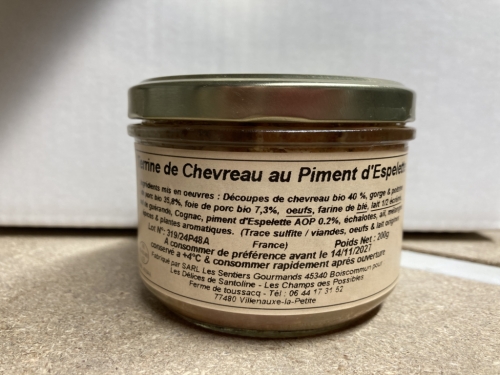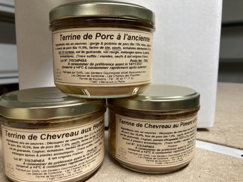 ![]() | Lot de 3 terrines chevreau et porc 1 terrine de campagne pur porc + 1 terrine de chevreau/porc piment d'Espelette + terrine de chevreau/porc herbes de Provence En savoir plus Conserve à base de viande de notre elevage.