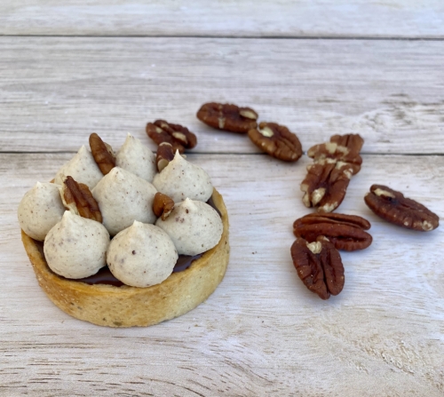 ![]() | Tartelette chocolat pécan Tartelette chocolat pécan diamètre 7 cm En savoir plus Pâte sucrée Dacquoise pécan Croustillant praliné pécan Ganache chocolat au lait Ganache montée praliné pécan Risques allergènes: fruits à coque, gluten, lactose, oeuf | 3.40 € la pièce | |