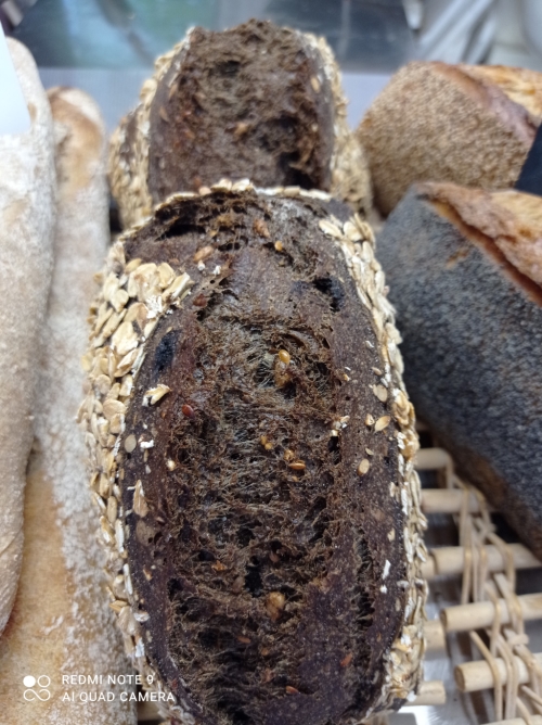 ![]() | Le Nordique En savoir plus Pain avec matl d'orge torréfié, farine de blé T80, farine de seigle, levain, sel, graines de tournesol, lin brun et doré, graines de sarrasin, flocons d'avoine et sésame. | 500 g | 4.00 € la pièce |