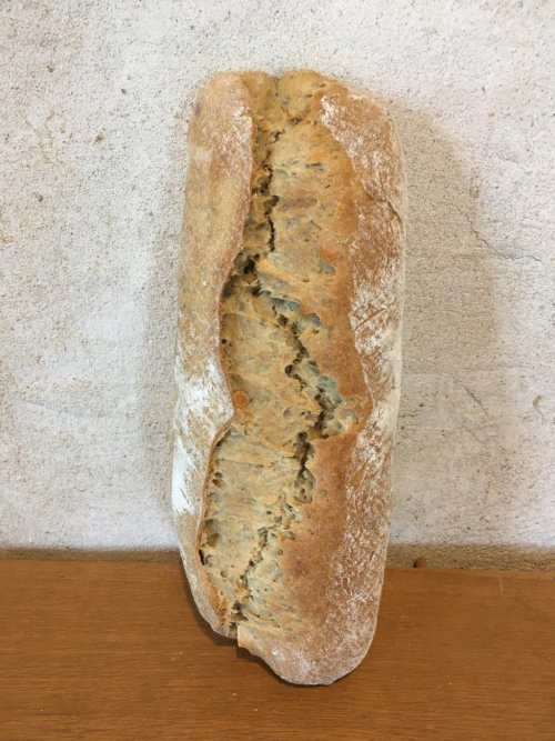 | Ciabatta Farine de froment T80,eau, levain liquide froment et seigle, sel de noirmoutier, huile d' olive, feuille de romarin | 500 g | 3.00 € la pièce |