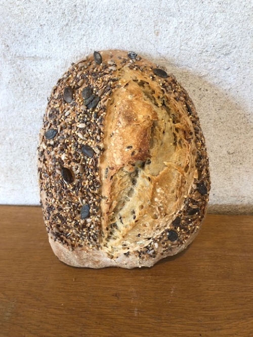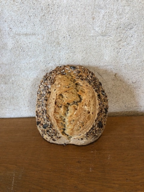 | Pain aux Graines 500gr Farine de froment T80,eau, levain liquide froment et seigle, sel de noirmoutier, graine de courges, millet, tournesol, lin doré, lin brun et chanvre | 500 g | 3.10 € la pièce |