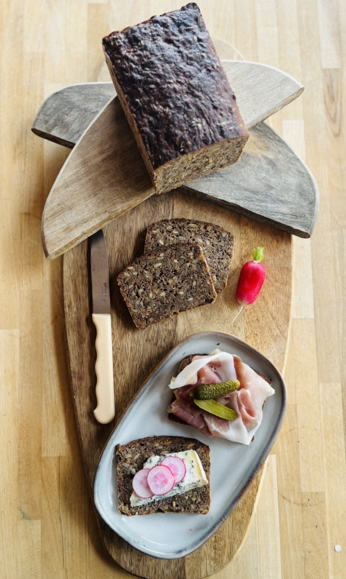 ![]() | Rugbrød Pain de seigle, porridge et graines lin-tournesol En savoir plus Pain danois moulé réalisé ici sans compromis, à savoir pur seigle, sans ajout de farine de blé qui viserait à le rendre plus consuel. Pain dense, aux arômes surprenants, à la structure dense mais moelleuse et à la conservation remarquable. Sa dégustation est intéressante avec une confiture de fruits rouges par exemple. Côté salé, il fait des merveilles en tartine avec des produits iodés. Composition : Farine de seigle T170 (Moulin Marion - St Jean s/Veyle - 01290) Eau filtrée Levain de seigle Seigle en grains (porridge) Graines de lin brun, blond, tournesol Sel de l'Atlantique Farines et graines issues de l'agriculture biologique - France Pièce de 650g environ | 650 g | 5.50 € la pièce |