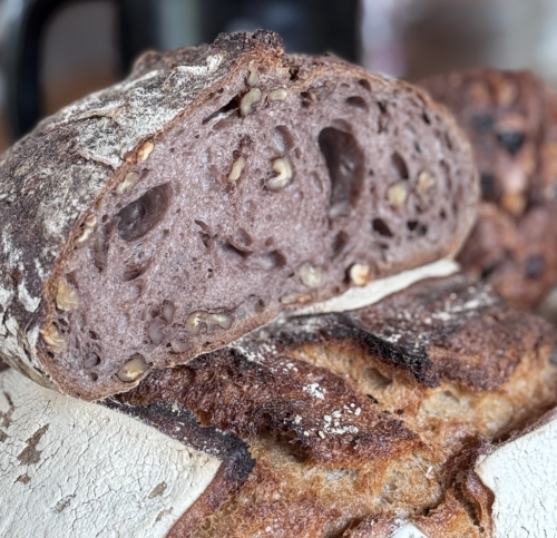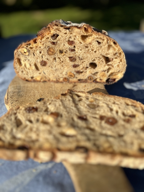 ![]() | Raisins-noisettes MOULE En savoir plus Ingrédients : Farine de blé semi-complète, levain de seigle (farine de seigle + eau), raisins, noisettes, eau, sel. | 12.00 € le kg | |